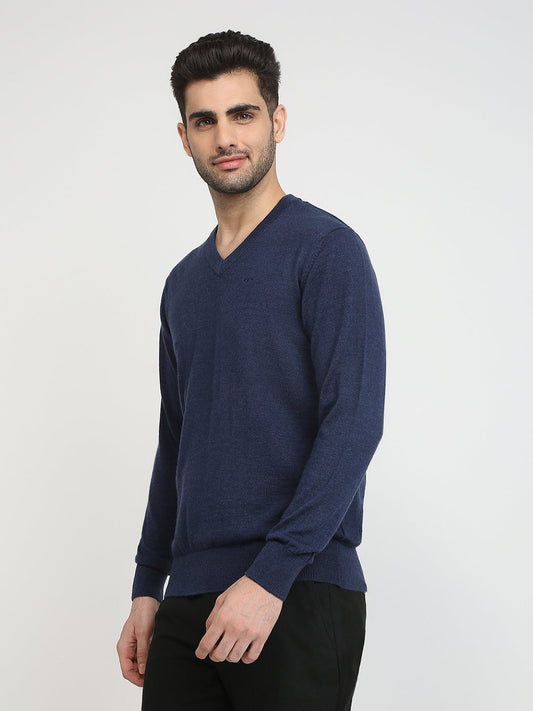 Colorplus Men Blue Solid Regular Fit Wool Blend Full Sleeve V Neck Collar Sweater
