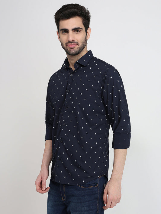 Raymond Men Blue Printed Slim Fit Cotton Full Sleeve Cut Away Collar Casual Shirt