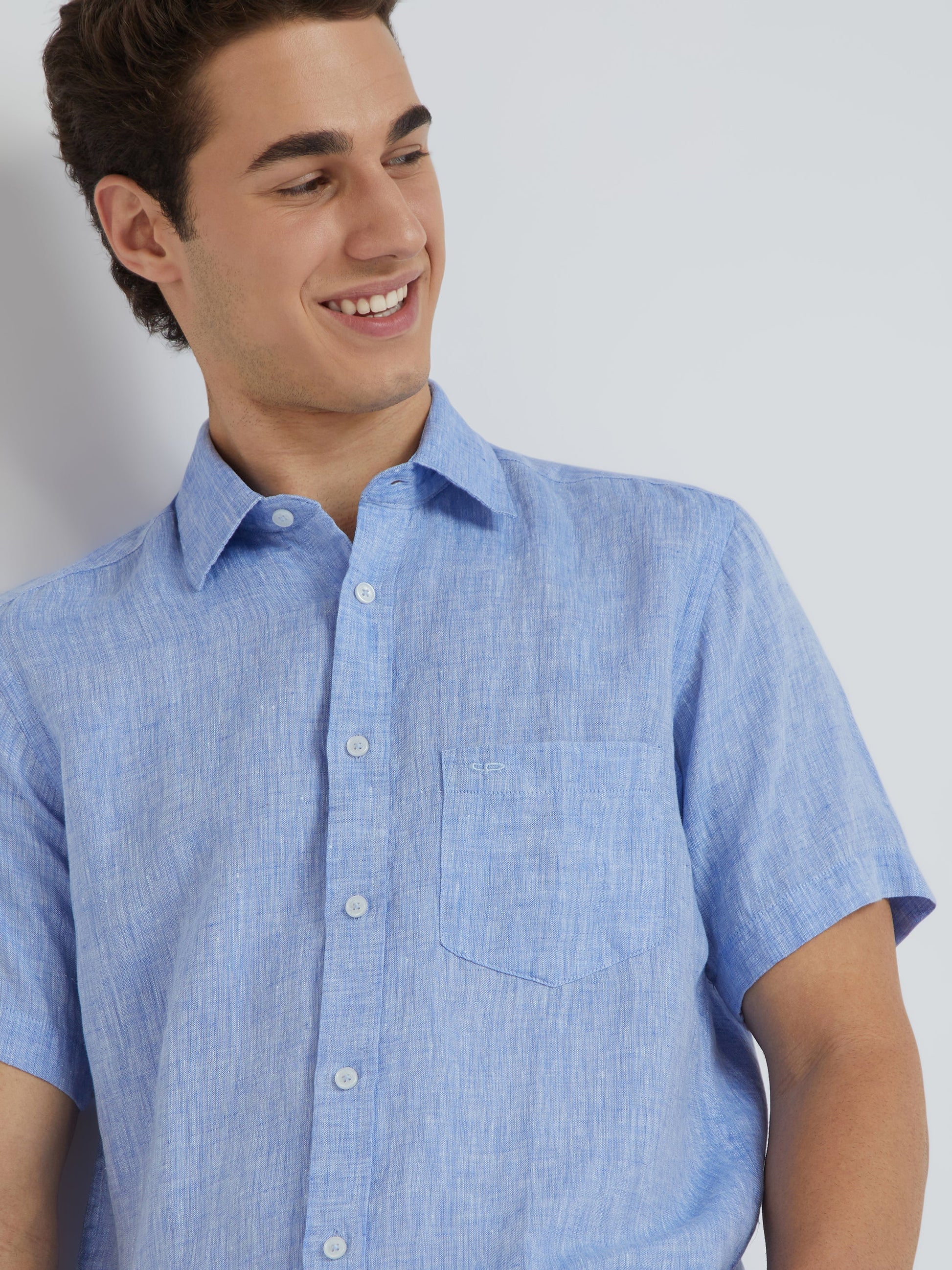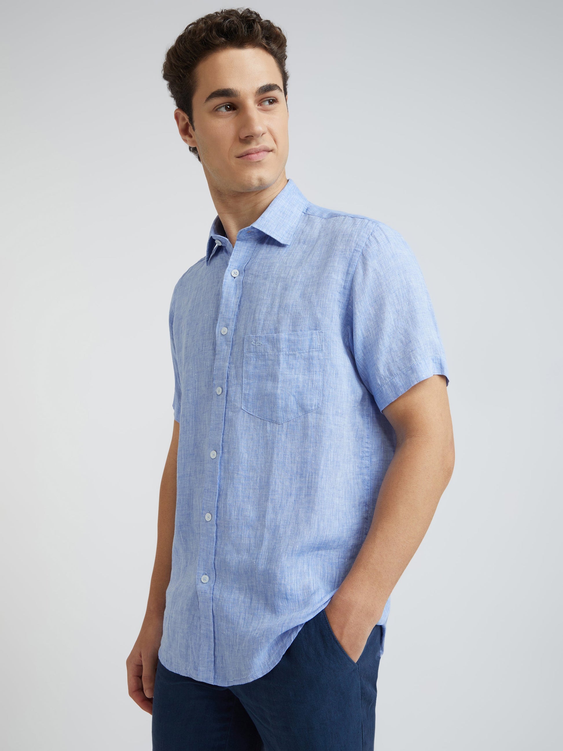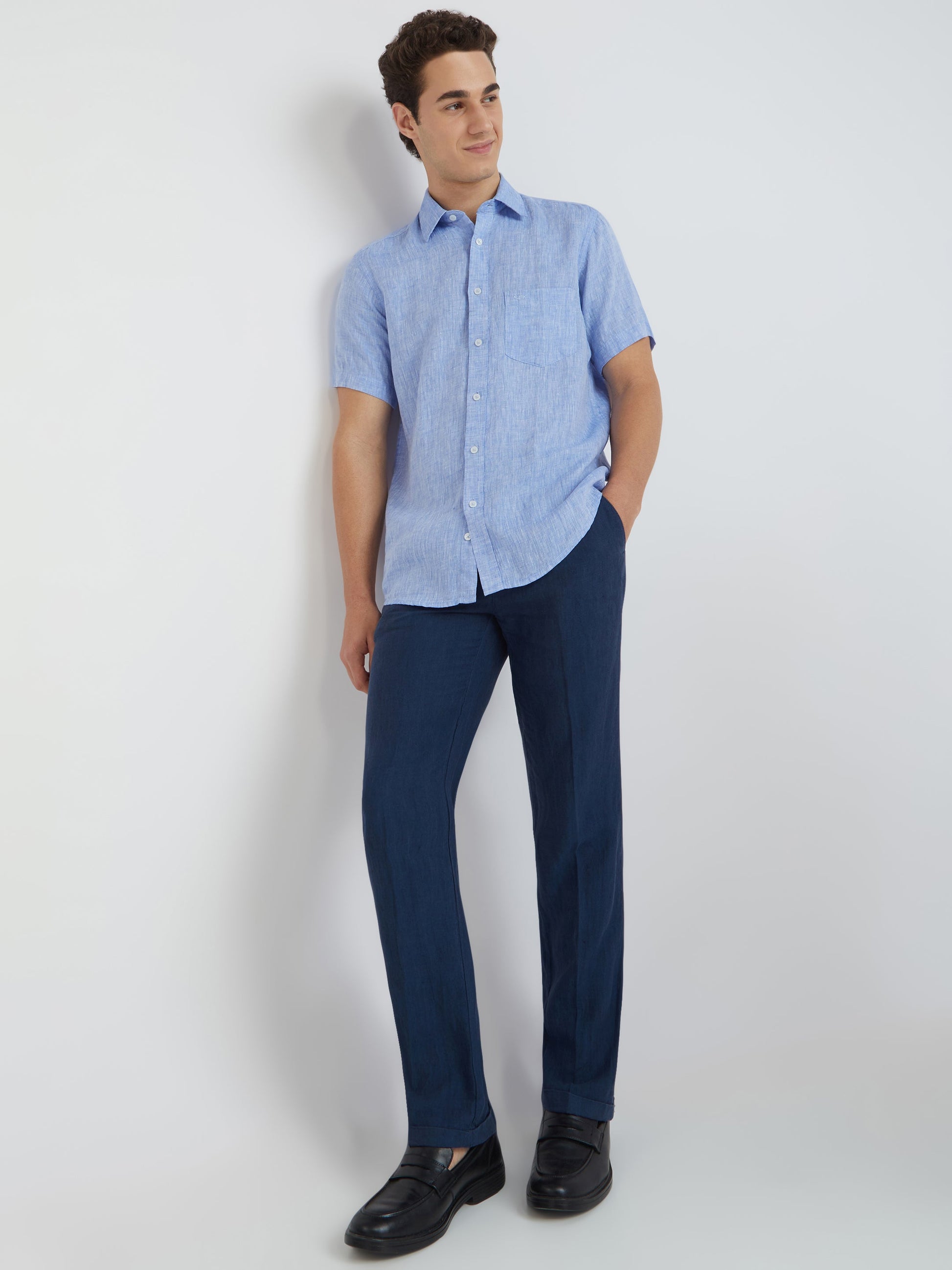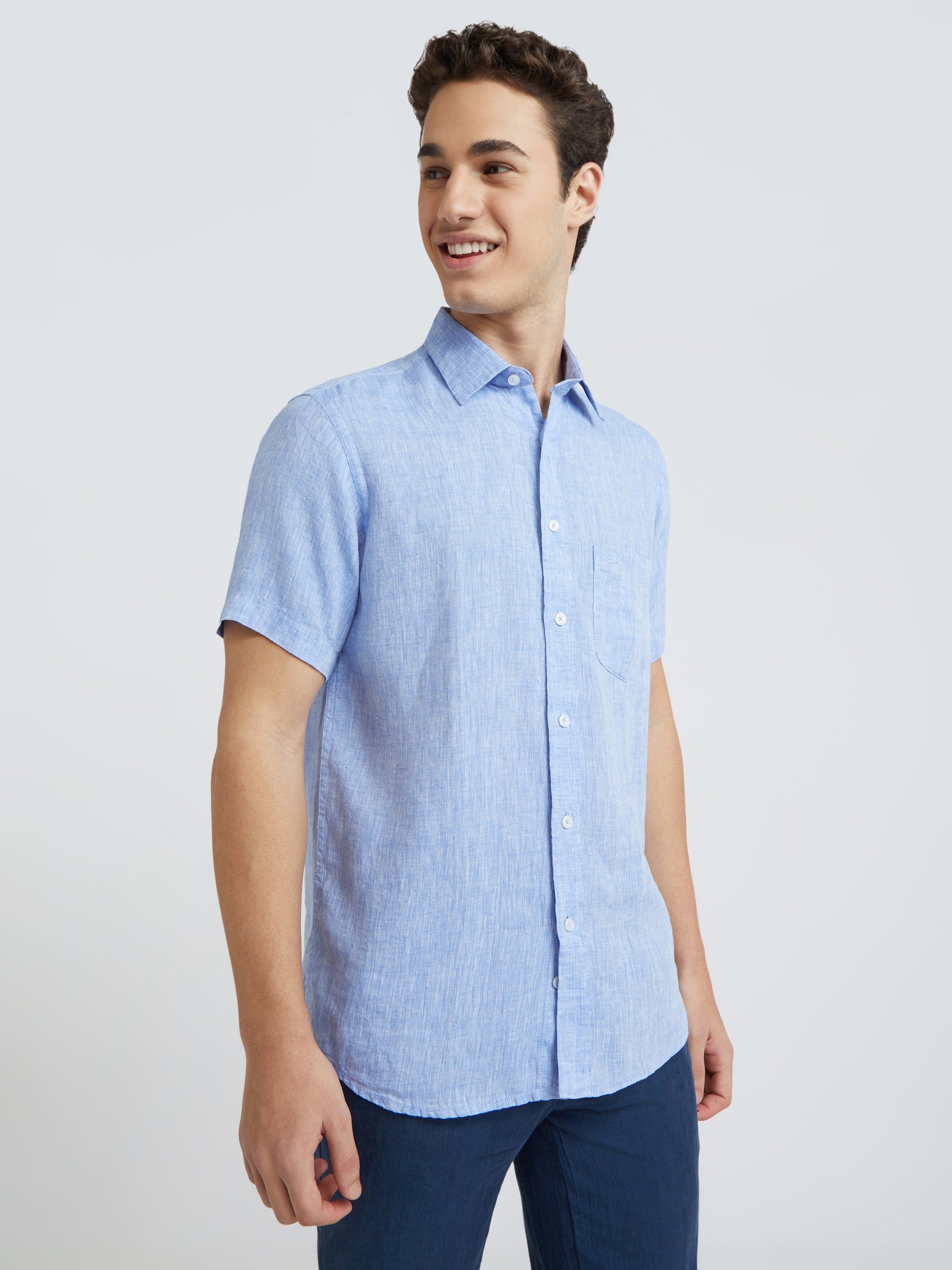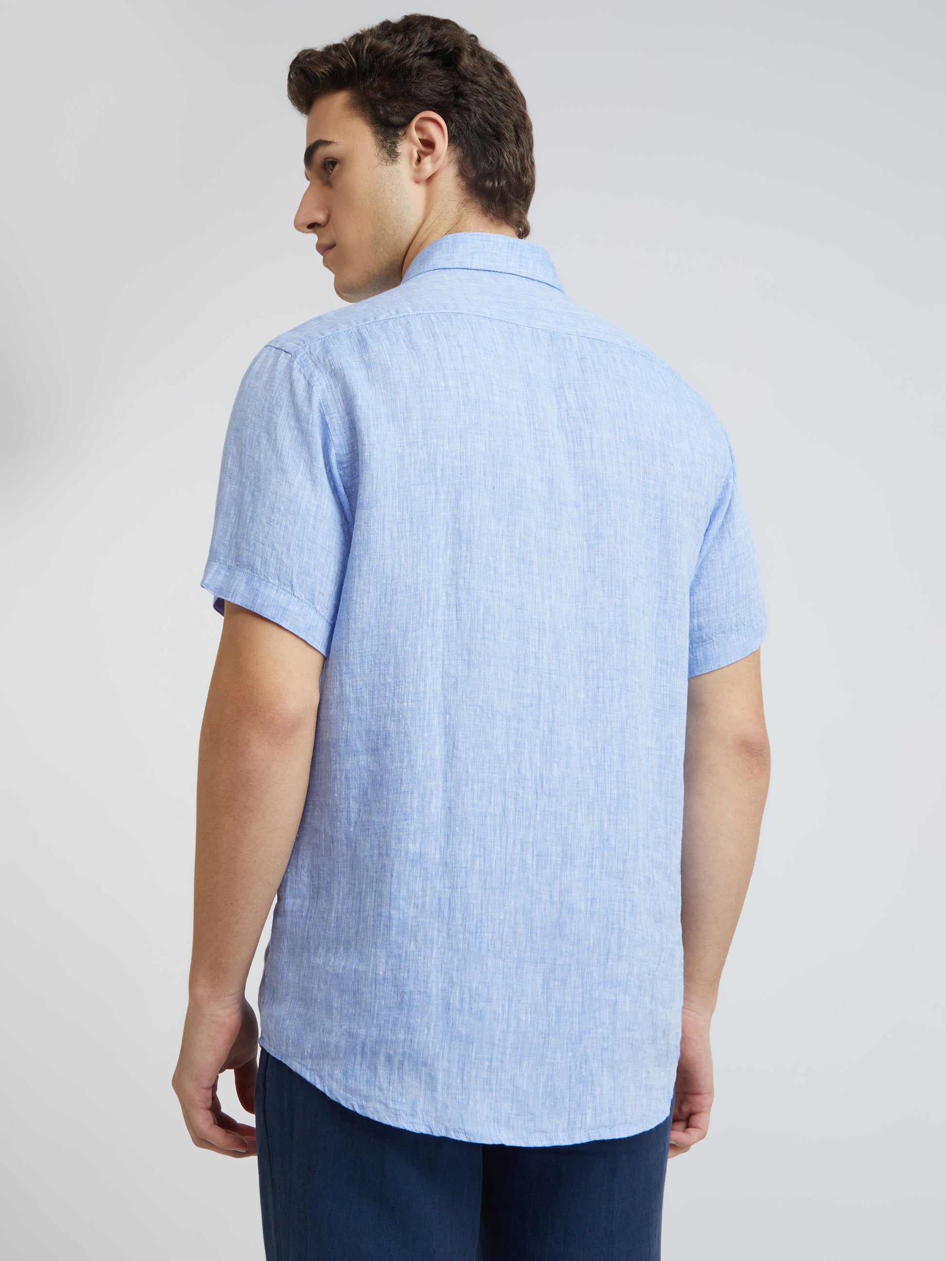 Men Blue Yarn Dyed Tailored Fit Linen Half Sleeves Casual Shirt