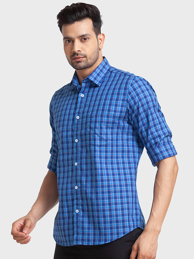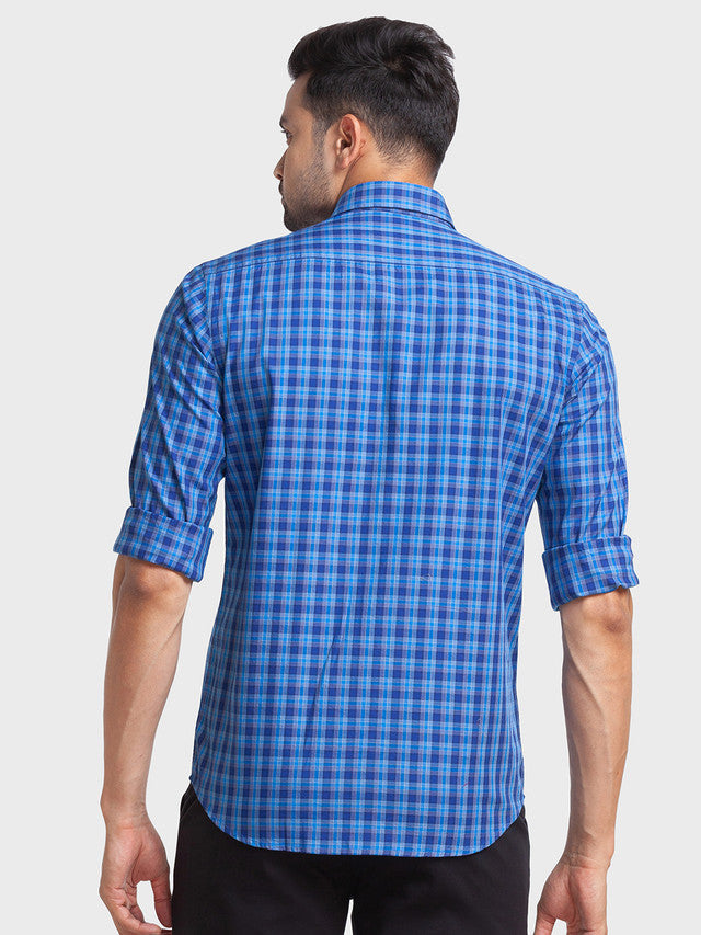 Men Blue Checkered Tailored Fit Full Sleeve Spread Collar Shirt