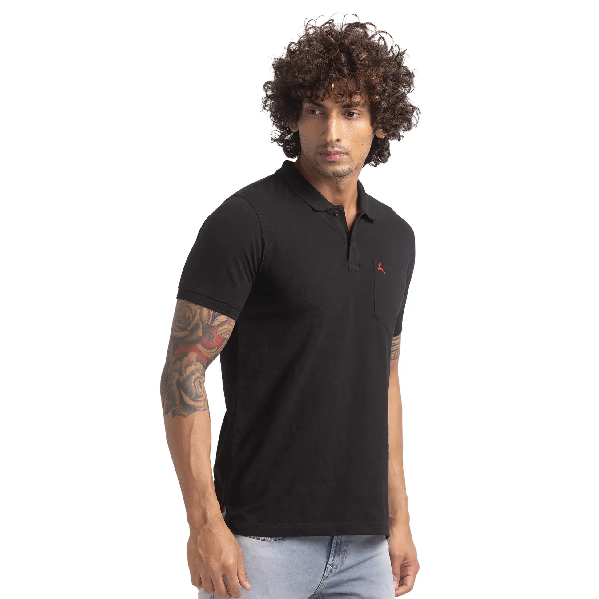 Men Black Regular Fit Solid Cotton Round Neck Collar Polo T-Shirt