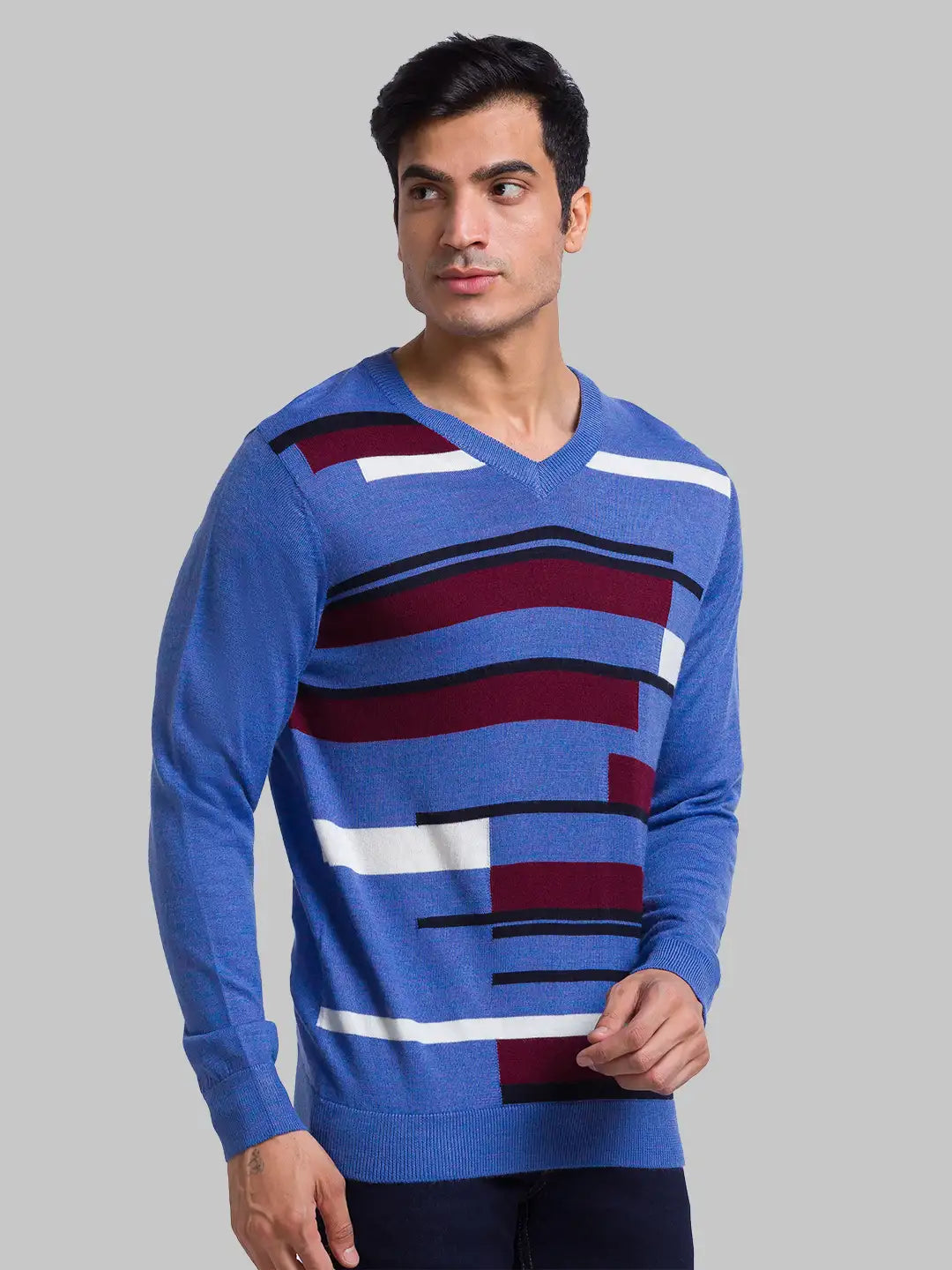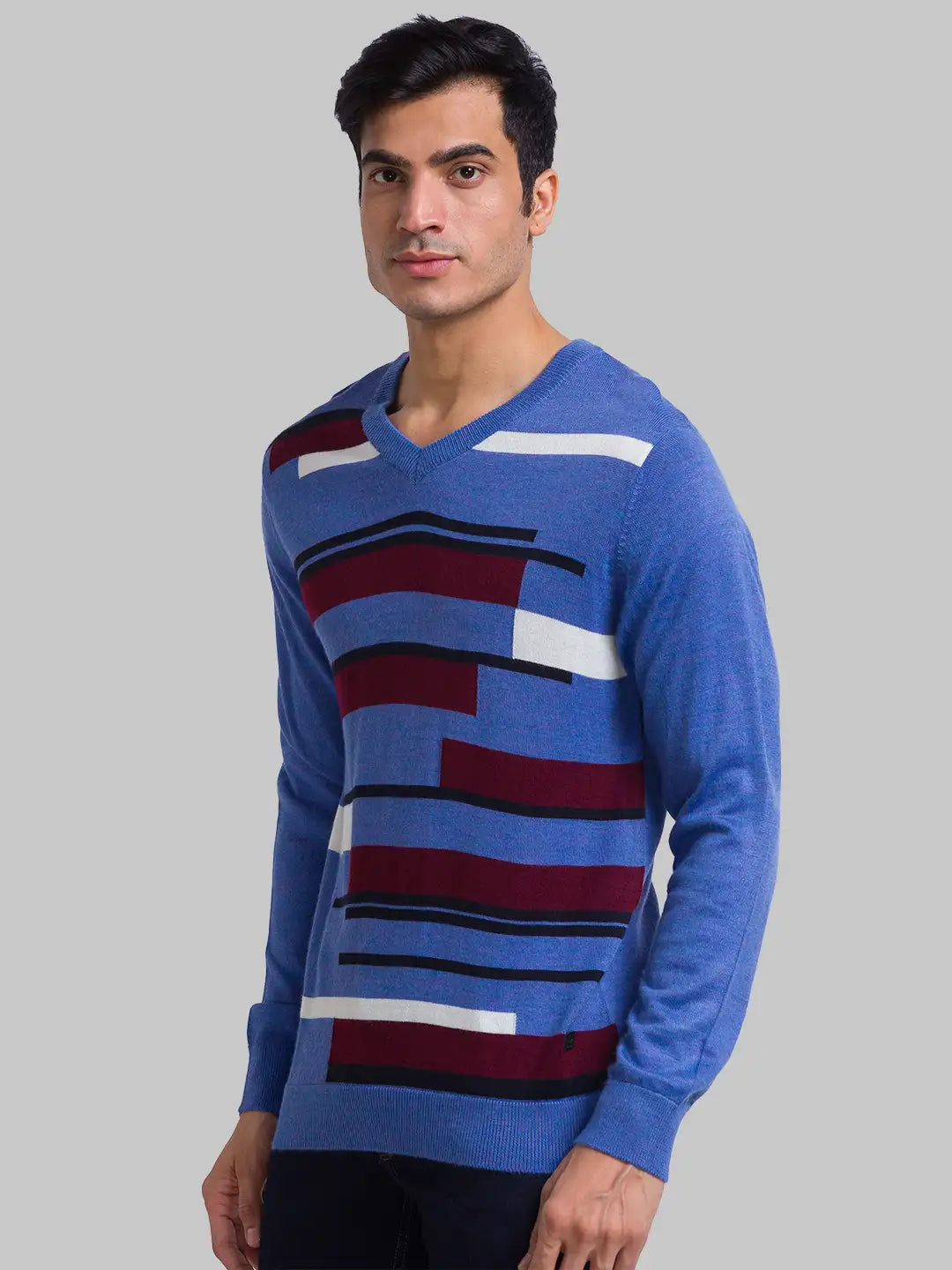 Men Blue Intarsia Acrylic Blend Full Sleeve Sweaters