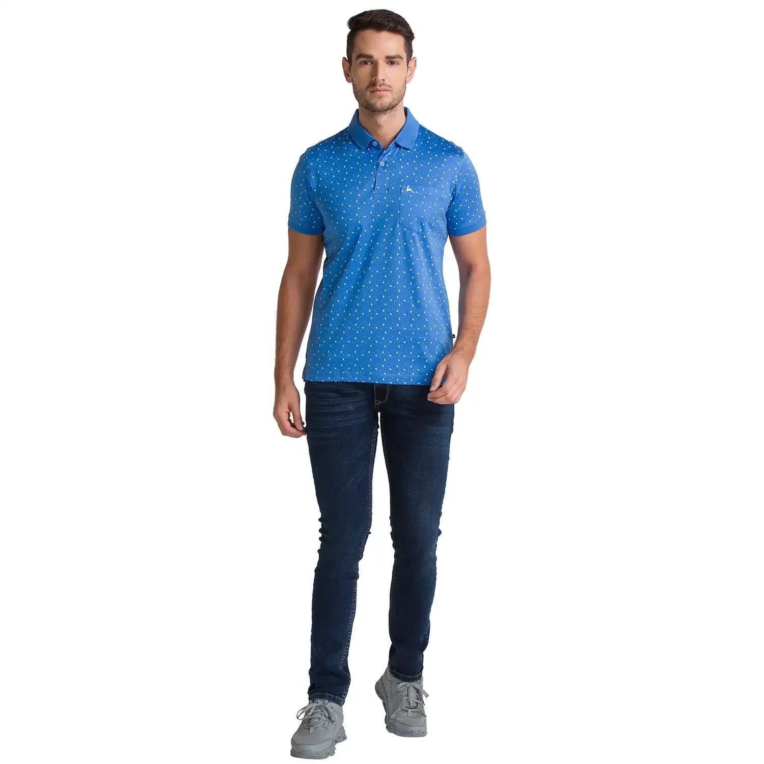 Men Blue Regular Fit Print Cotton Round Neck Collar Polo T-Shirt