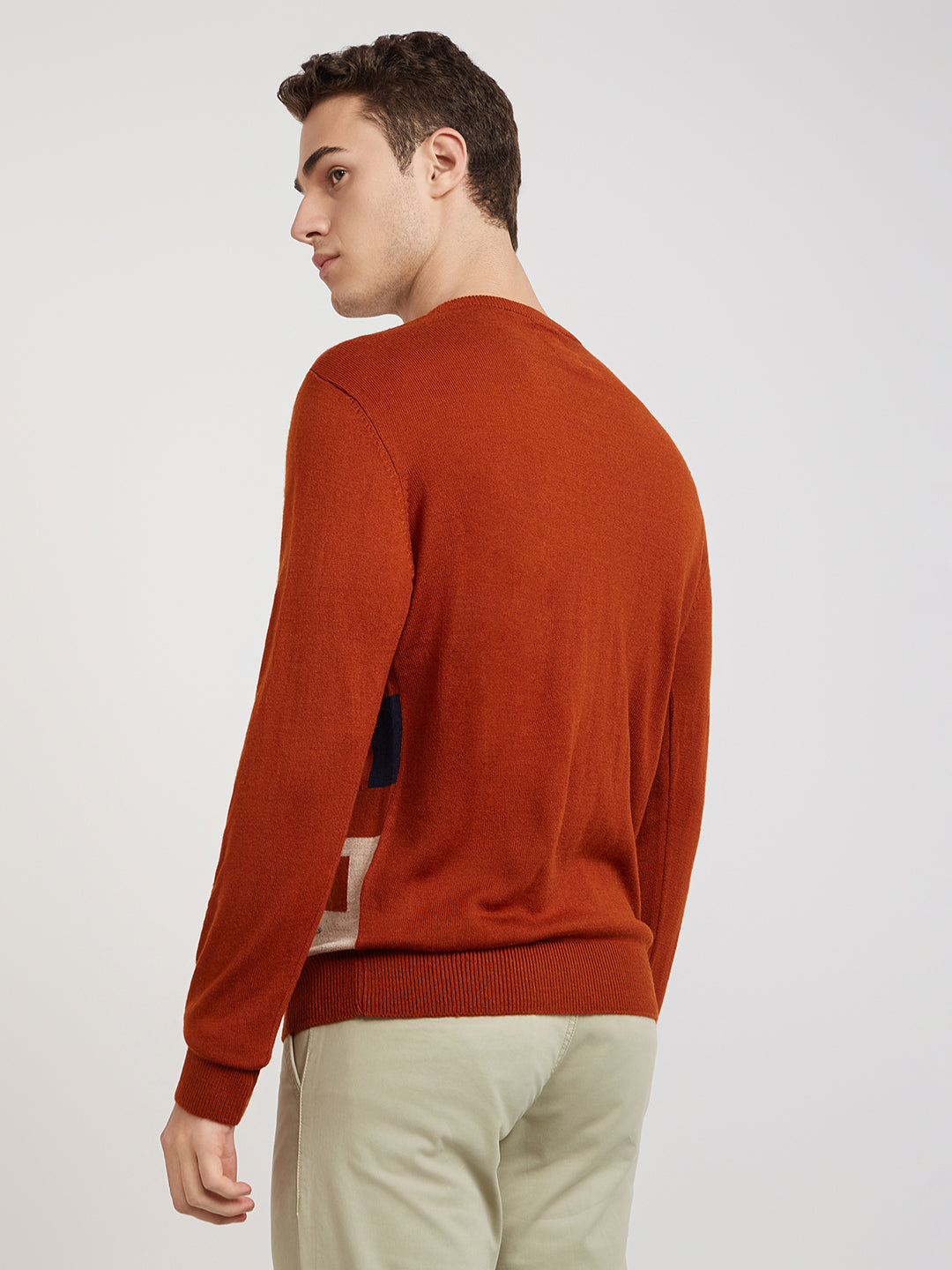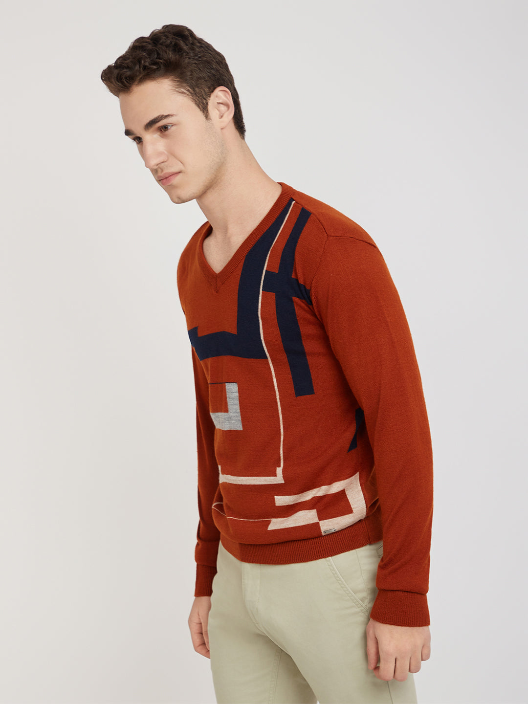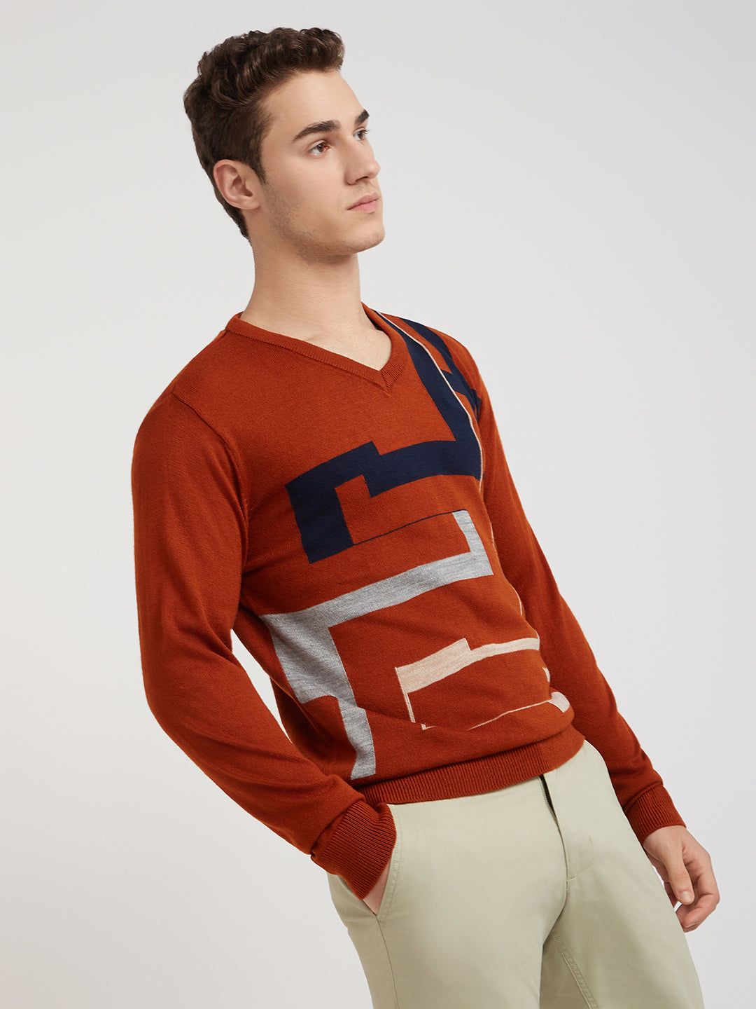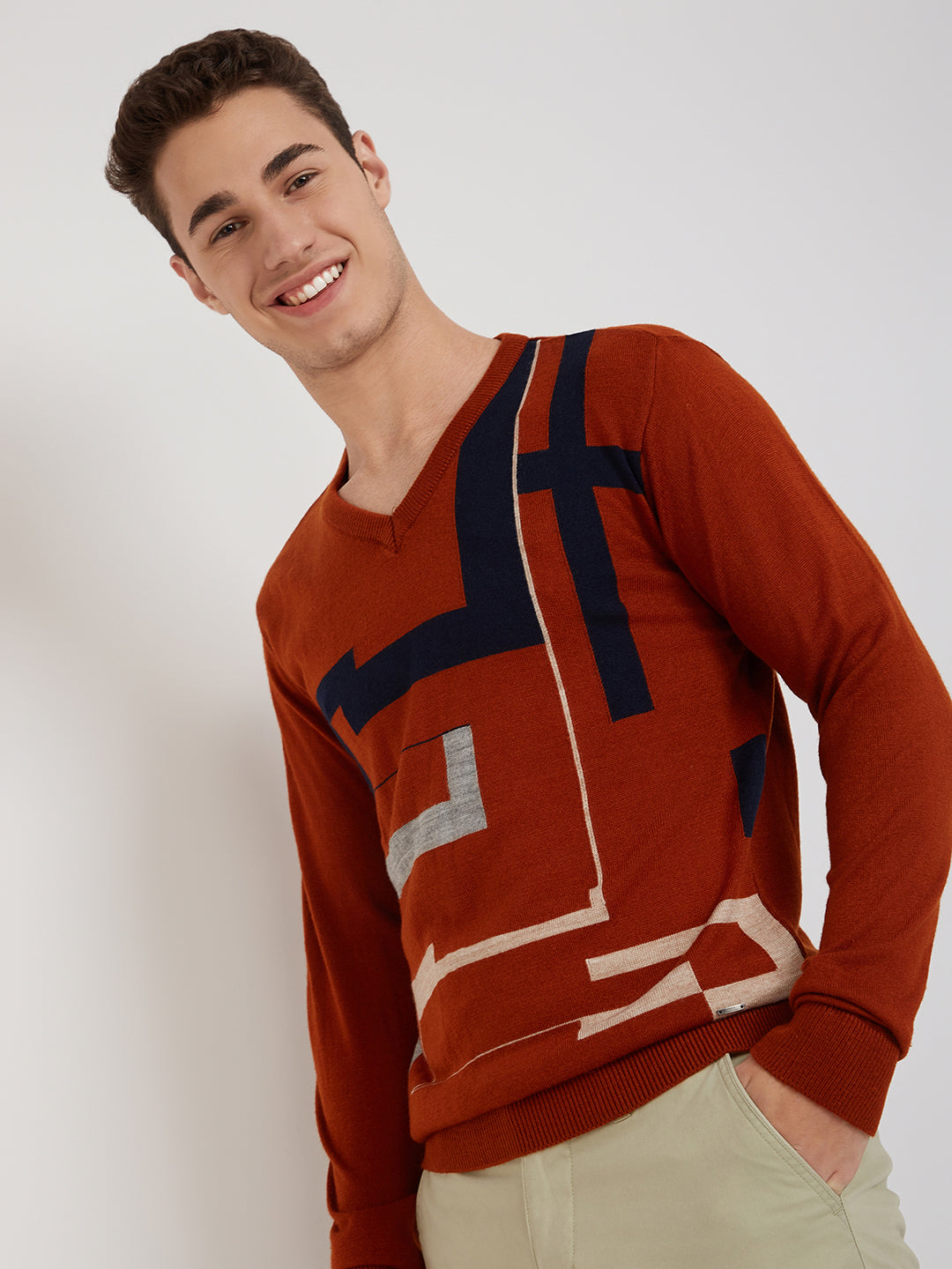 Men Orange Intarsia Acrylic Full Sleeve Sweaters