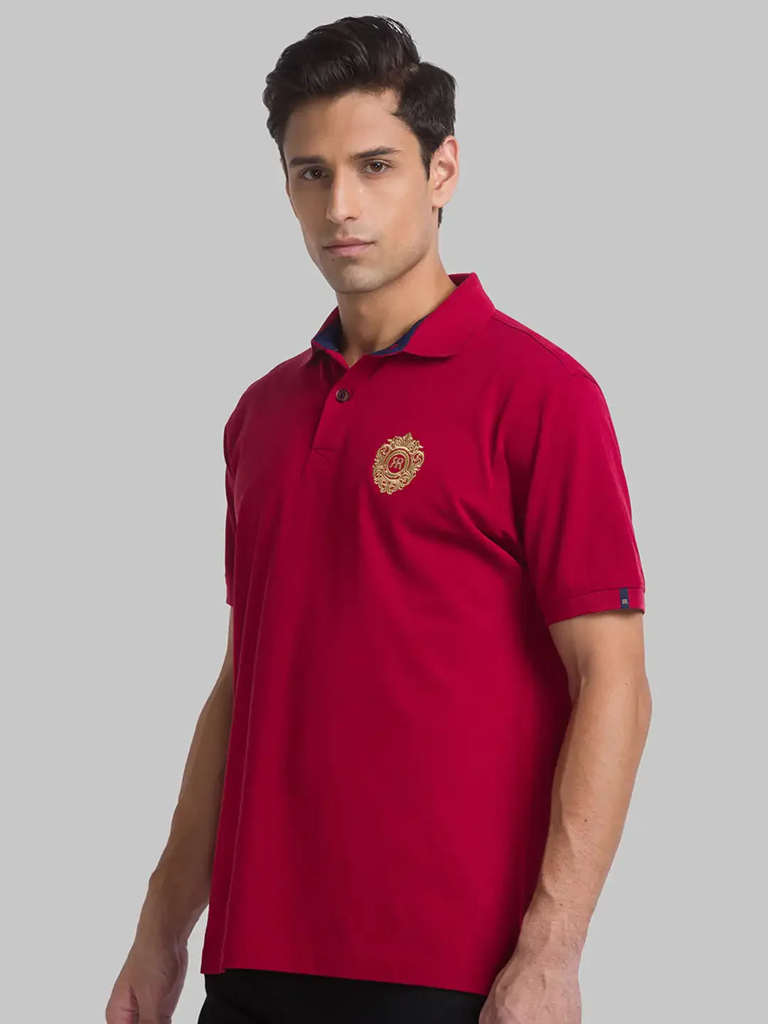 Men Red Contemporary Fit Solid Cotton Round Neck Collar Polo T-Shirt
