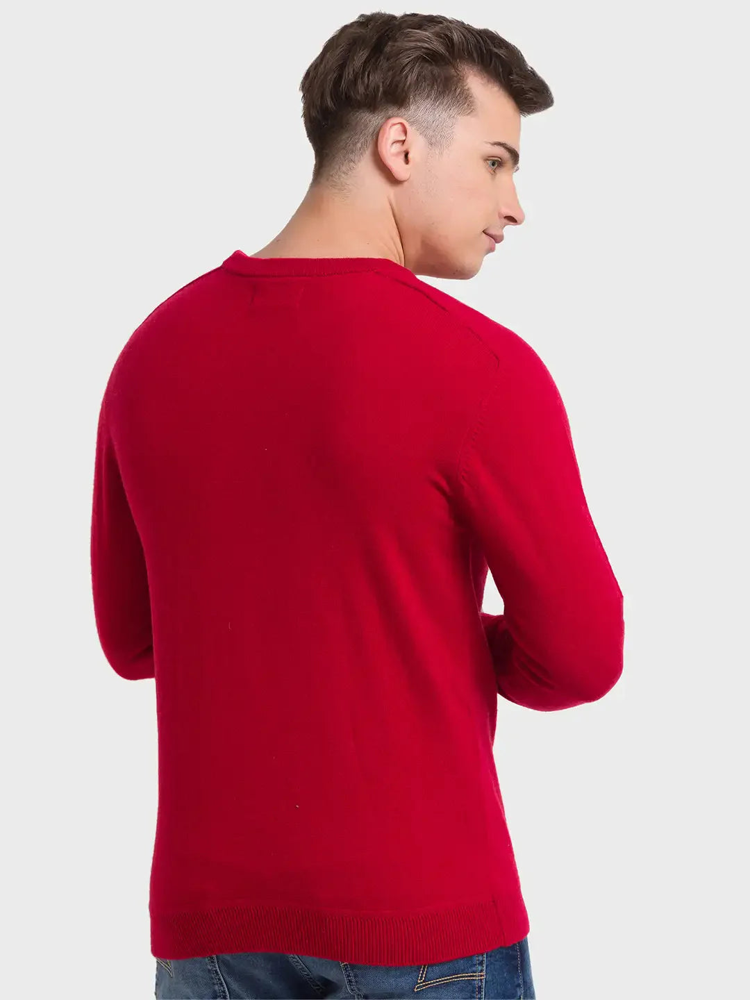 Men Red Tailored Fit Solid Wool Blend Full Sleeve V Neck Collar Sweaters