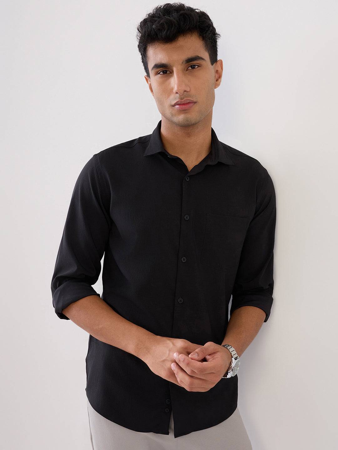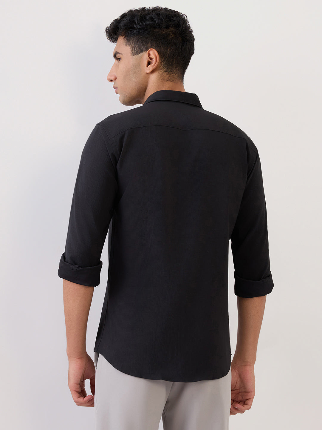 Men Black Stripe Slim Fit Polyester Full Sleeve Formal Shirt
