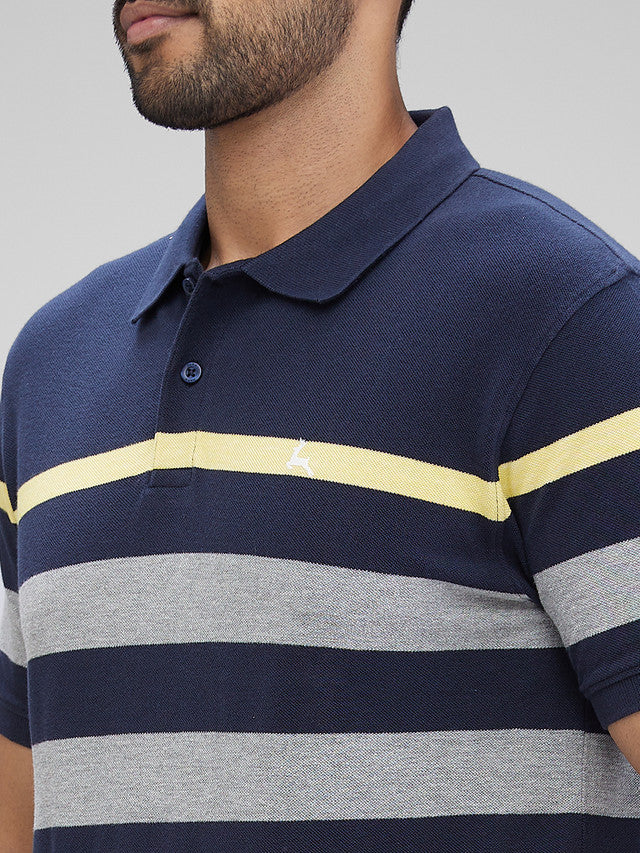 Men Blue Yarn Dyed Regular Fit Cotton Blend Polo Neck T-Shirt