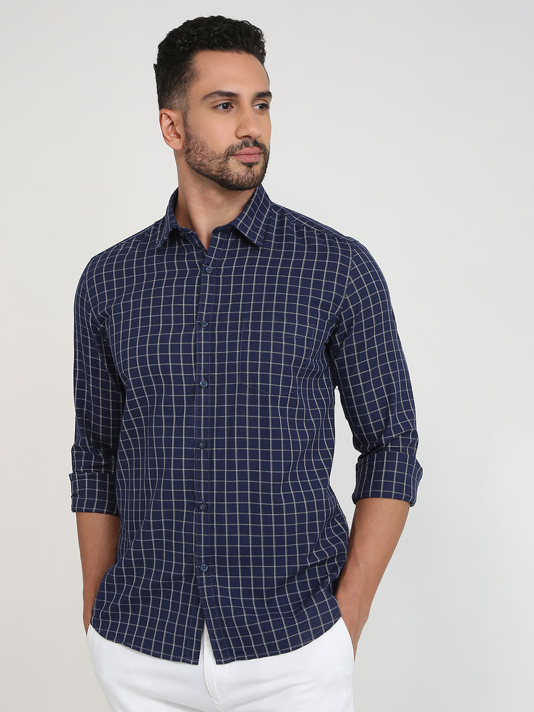 Men Blue Checks Slim Fit Cotton Casual Shirt