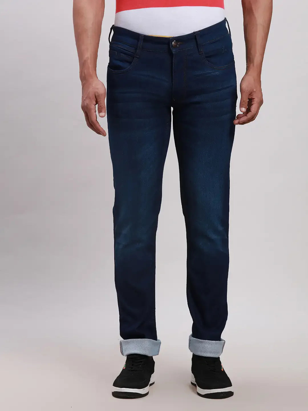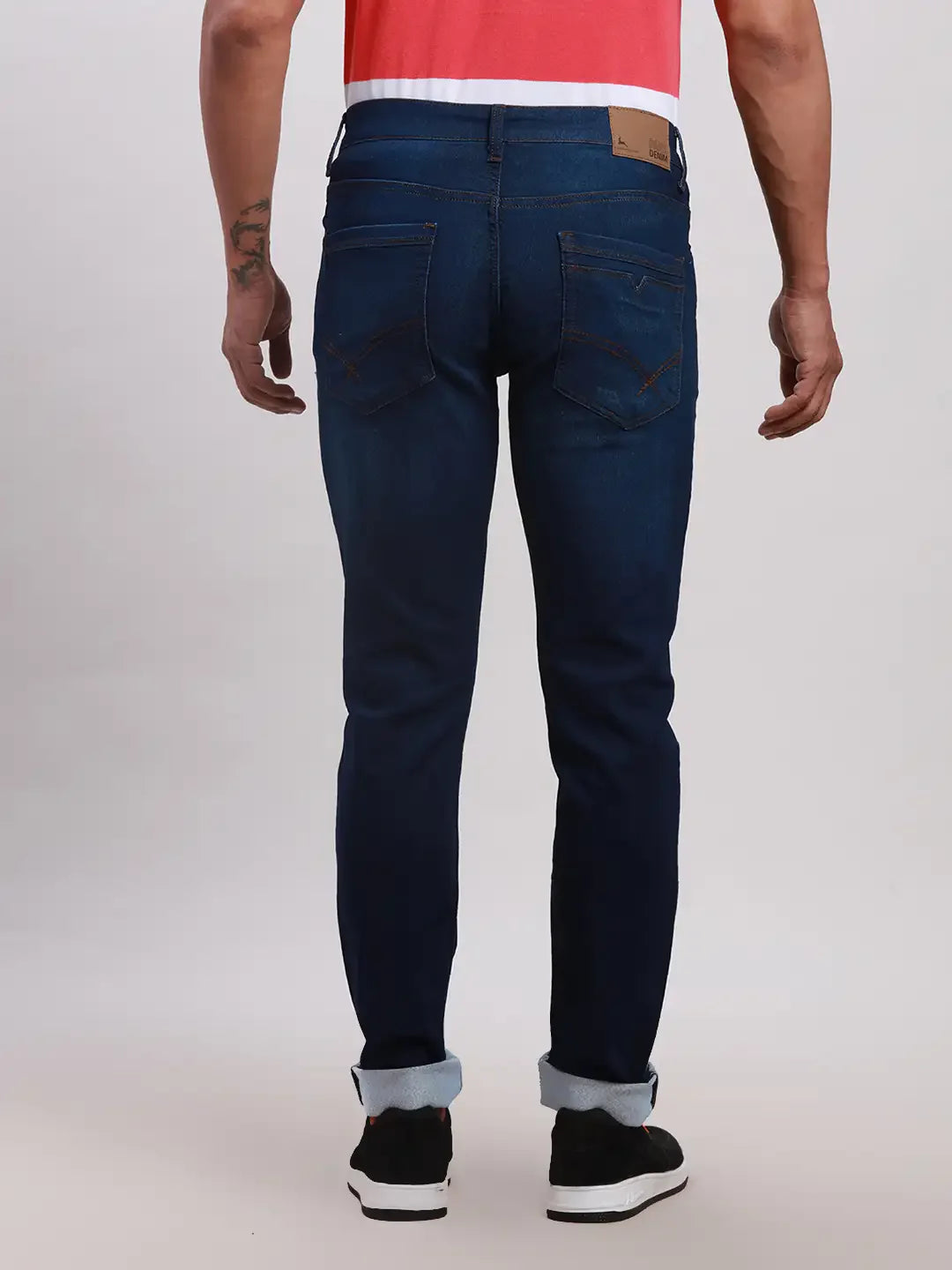 Men Blue Plain Slim Tapered Fit Cotton Blend Jeans