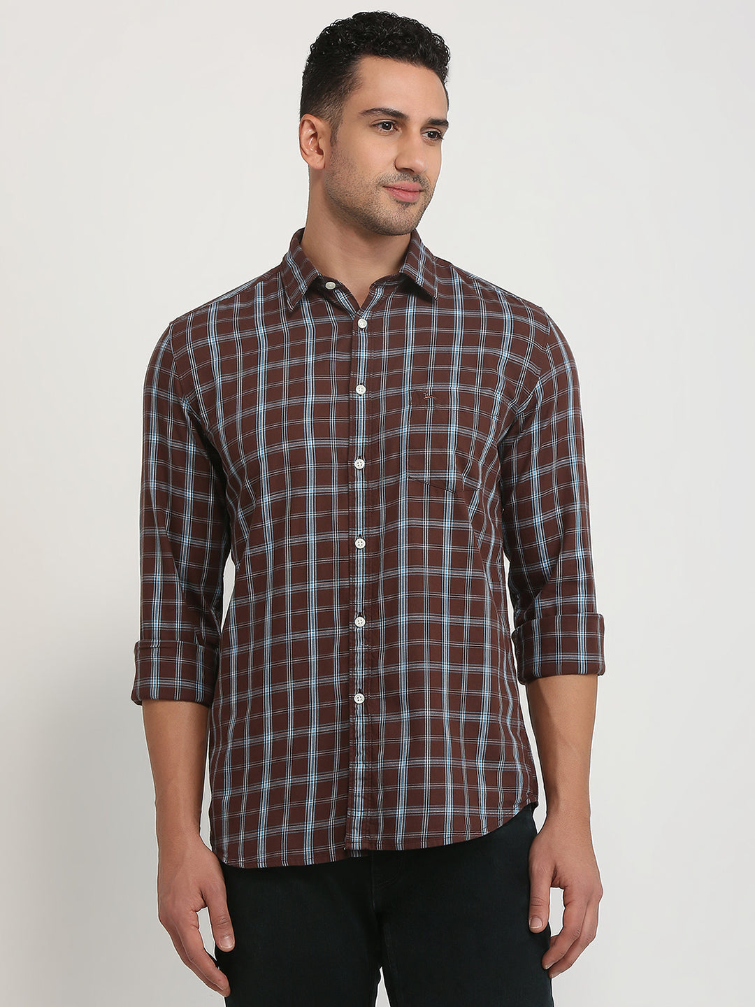 Men Brown Checks Slim Fit Cotton Casual Shirt