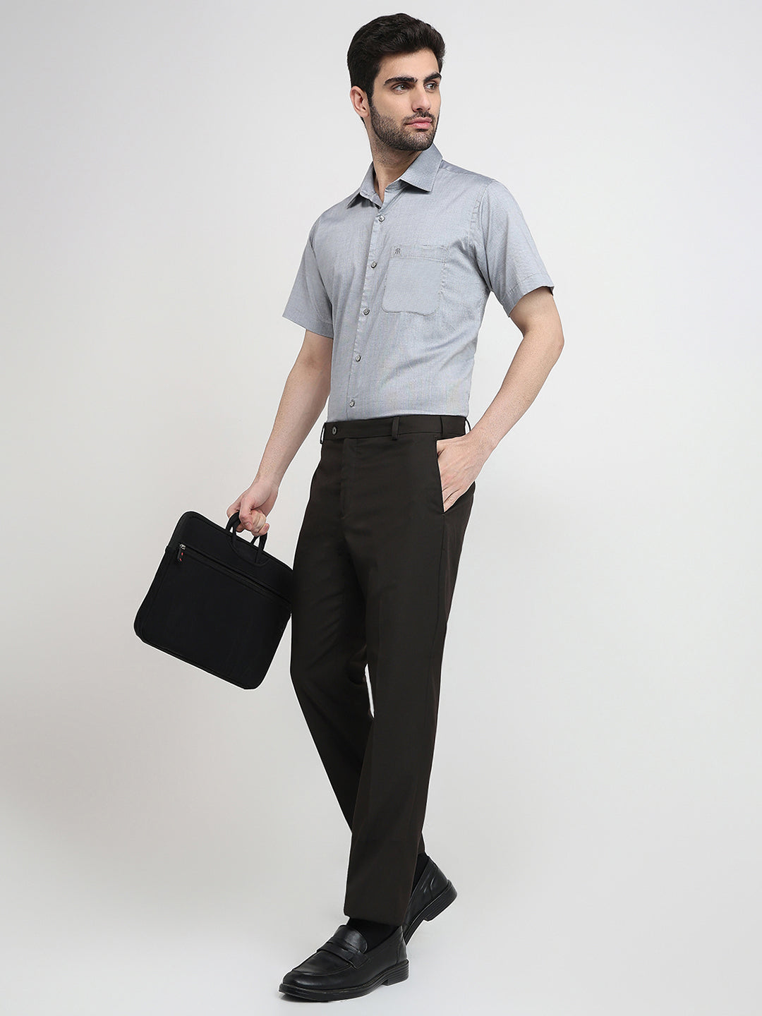 Raymond Men Grey Solid Chambray Regular Fit Cotton Half Sleeve Formal Shirt